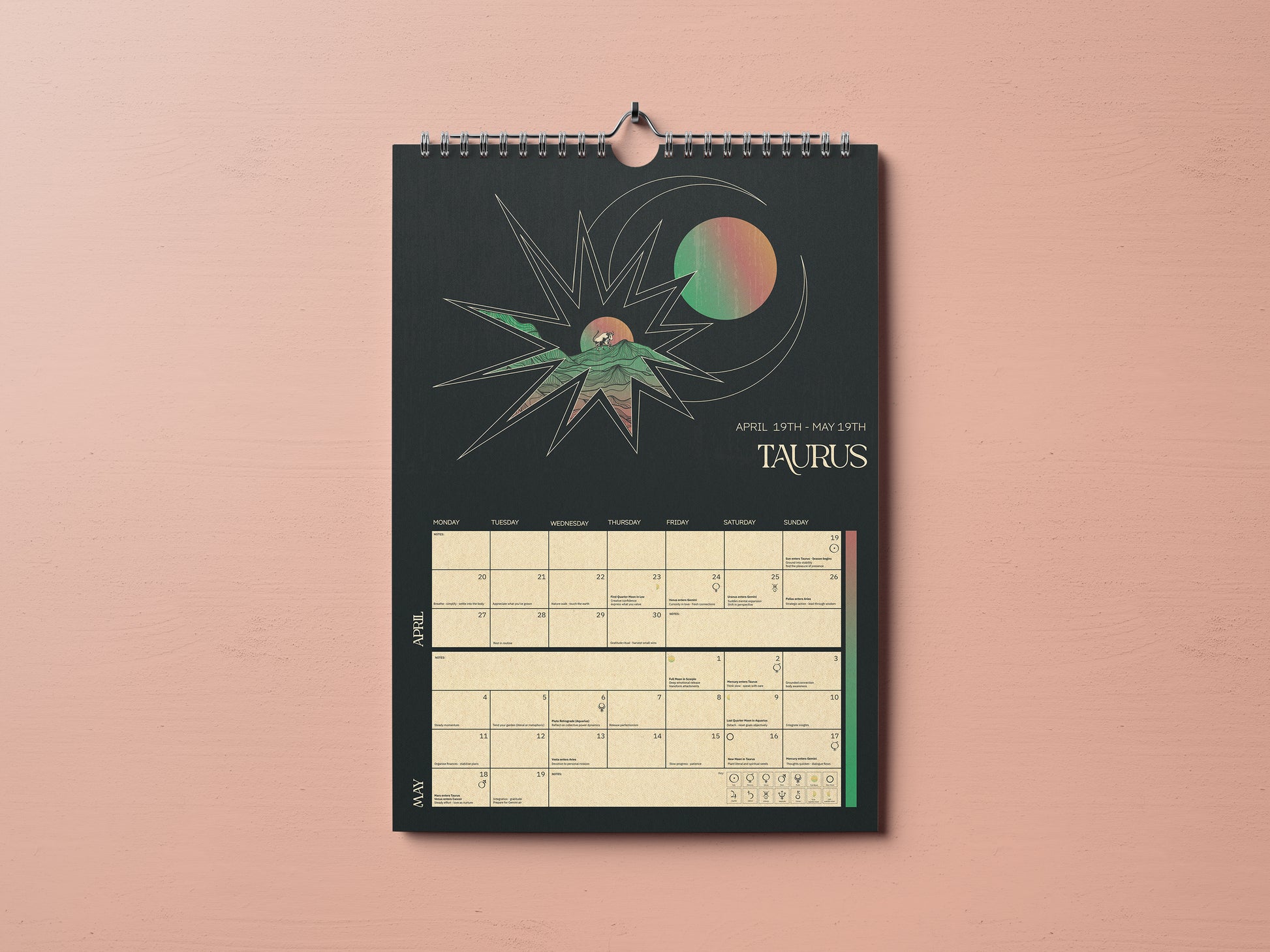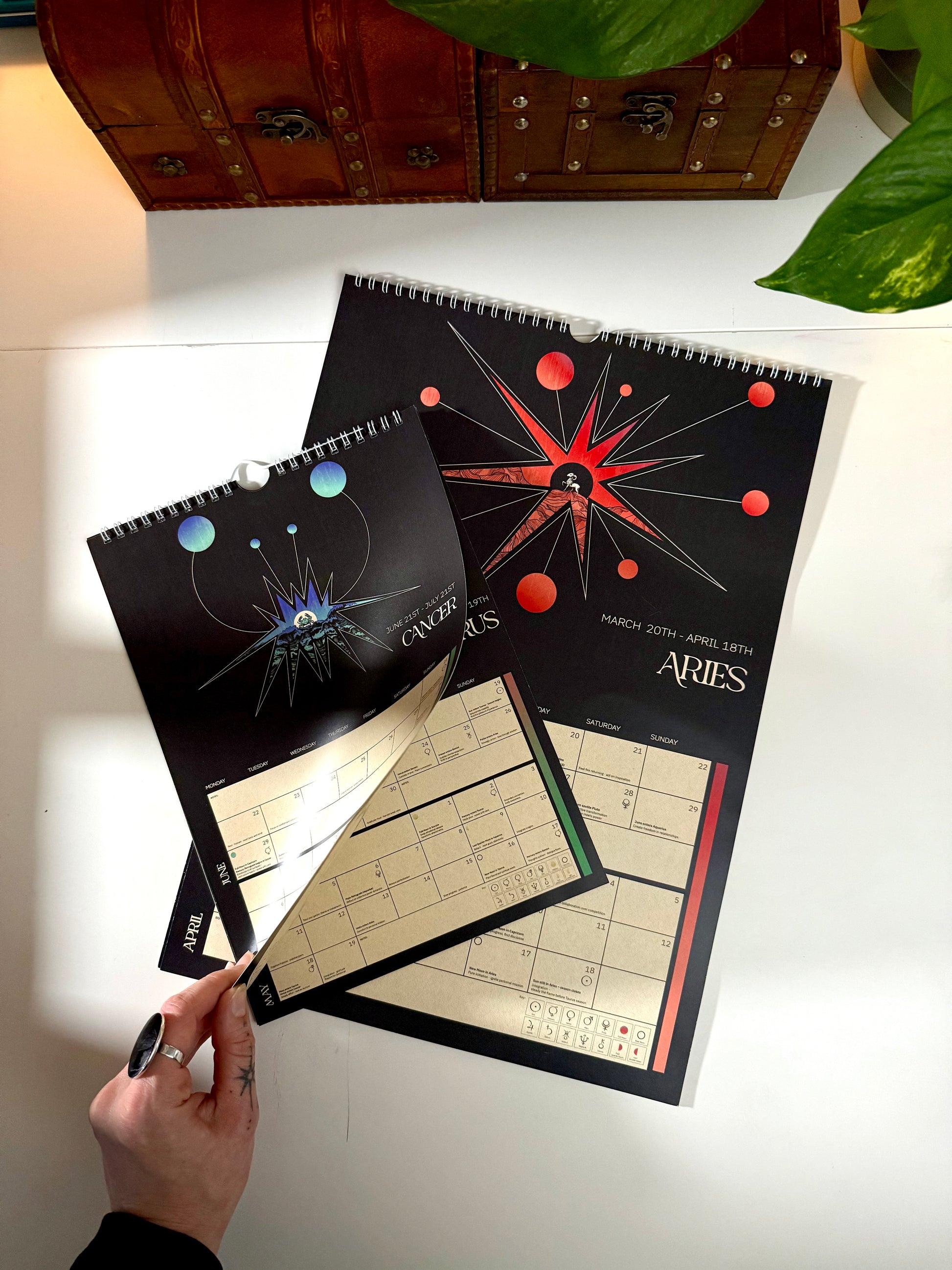 A beautifully illustrated, astrology-based calendar that follows the true zodiac seasons, moon phases, and key planetary movements, so you can plan your year by energy, not just dates.